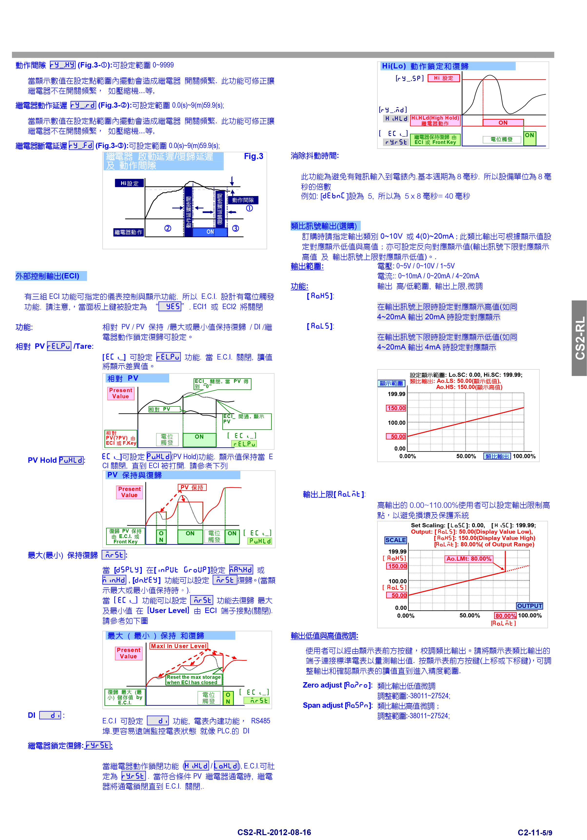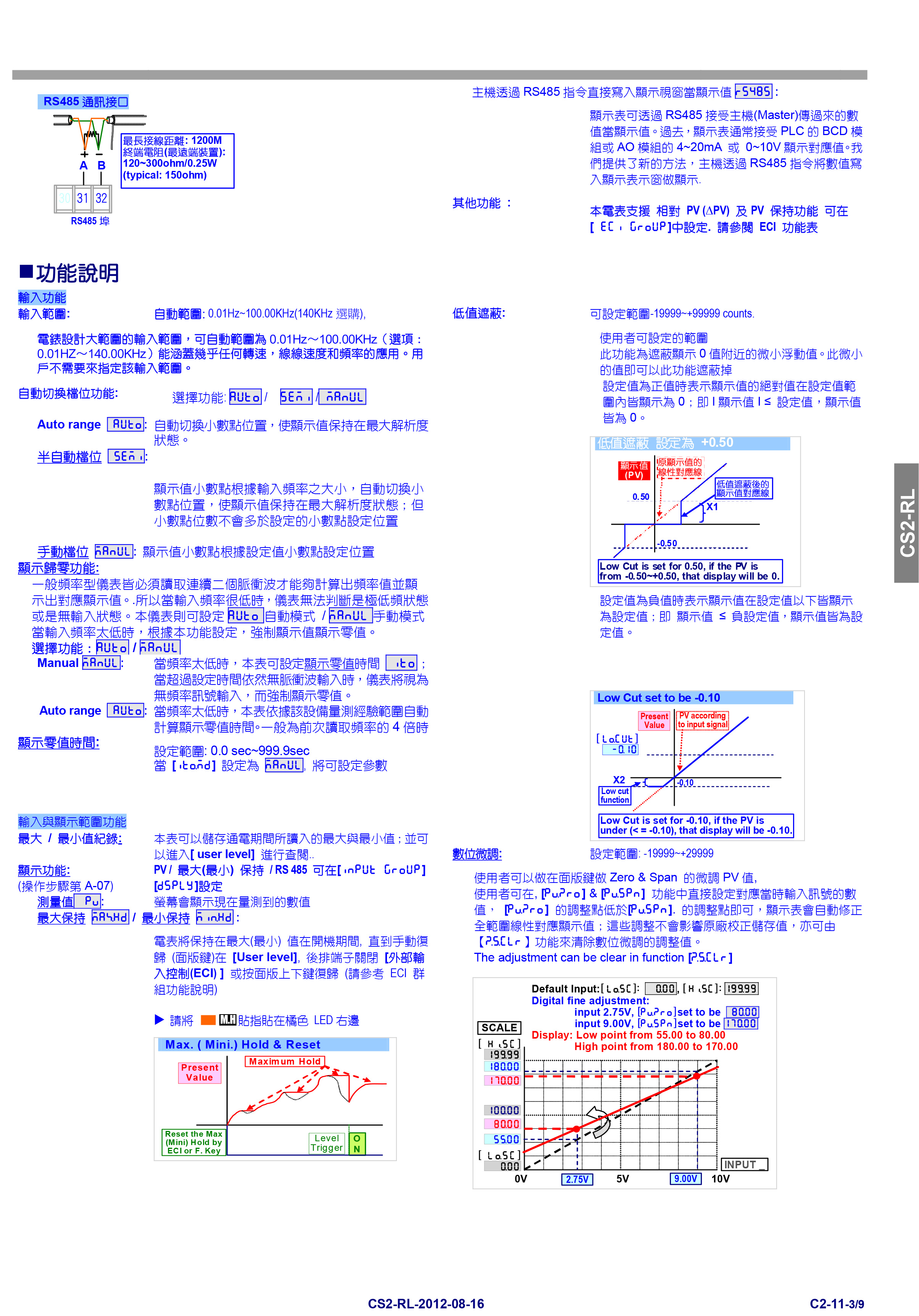CS2-RL RPM 控製器具有高精度針對(duì)脈(mò)衝 (頻率)的測量、顯示、控製和遠(yuǎn)端通訊功能。 自由頻率輸入達(dá) 0.01Hz~ 100KHz (可選購~140KHz),顯示解析度會自動根據輸入最大頻率做顯示改變。 內建 4 組 繼(jì)電器輸出, 3 組(zǔ)外部控製輸入(ECI), 1 組類比(bǐ)輸出及 1 組 RS485(Modbus RTU Mode) ; 提供多元的控製、警報、再傳送(sòng)與通信功能(néng); 可(kě)廣泛的應用在各種(zhǒng)機械設備、檢測設備、製(zhì)程控製、訊號收集處理及中央(yāng)監控等。