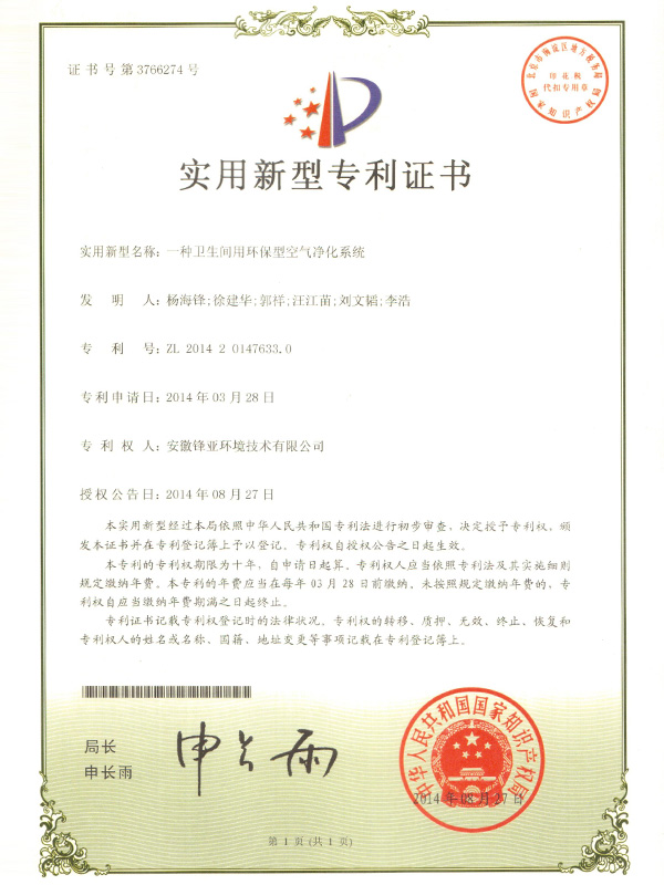 一種衛生間用環保型(xíng)空氣淨化係統